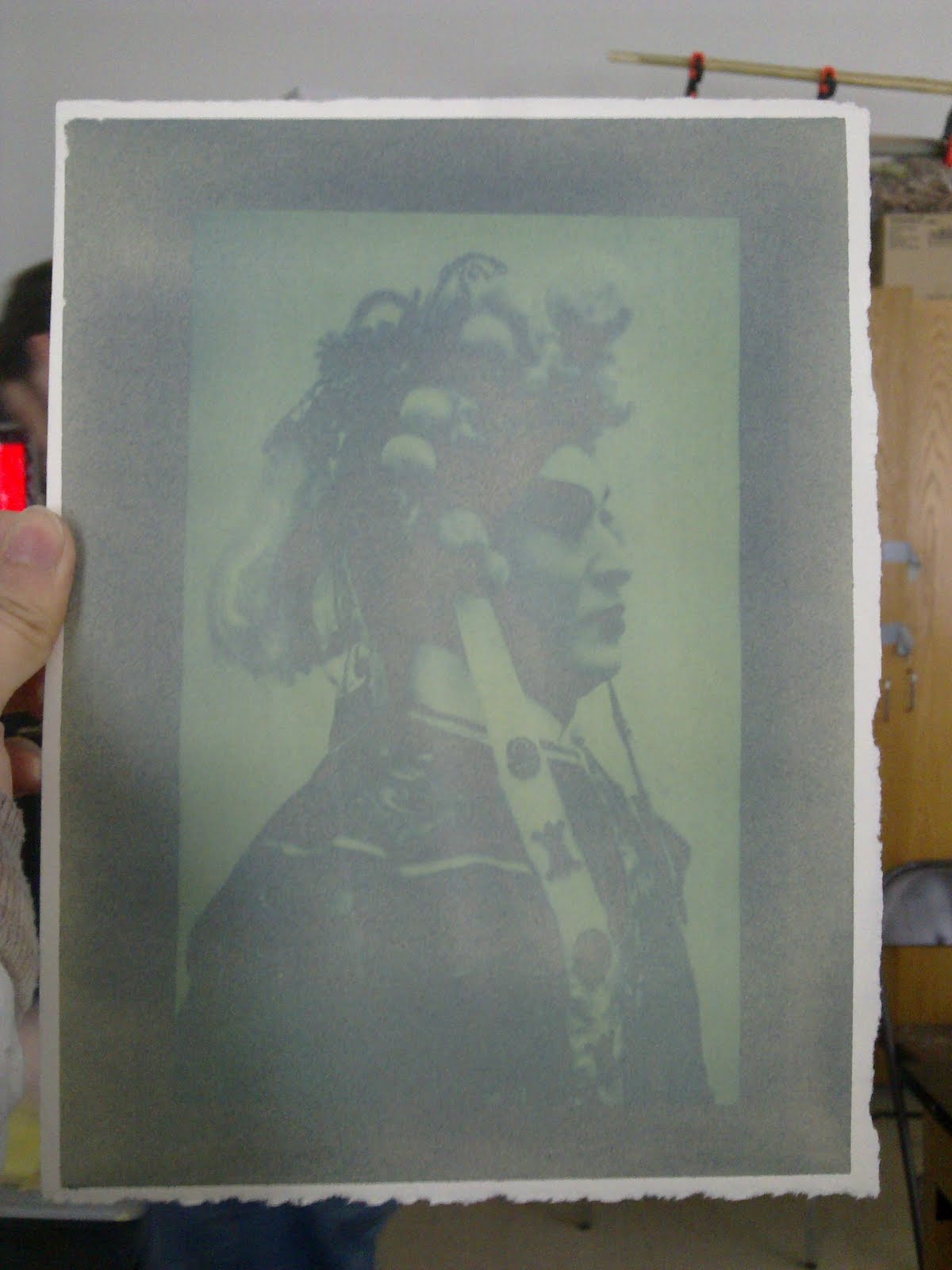 The following formula was taken from Bob Schramm’s article in Post-Factory Photography. I have tried varying the amounts of each of the three ingredients but have found the basic formula to give the best results. Adding more tartaric acid seemed to increase contrast slightly and move the image color to a more neutral gray but then graininess became a problem. Adding more silver nitrate didn’t have much effect, as was the case with more ferric ammonium citrate. I doubled the amount of all the chemicals in the formula in an attempt to make a single coat solution and got excellent contrast with rich blacks but grain was again a problem. A drop or two of 1% gold chloride can be added to the sensitizer just before coating to move the image color towards purplish-brown.